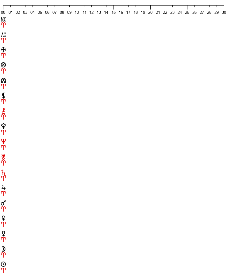 Moon/Lilith = 26 Vir 28Moon/Node = 24 Tau 12Moon/P. of Fortune = 05 Lib 55